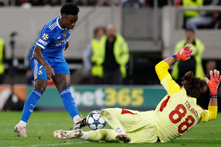 Vinícius Jr. respondeu aos 56 minutos com uma jogada individual sensacional, driblando três adversários dentro da área, mas Tzolakis voltou a negar o golo.